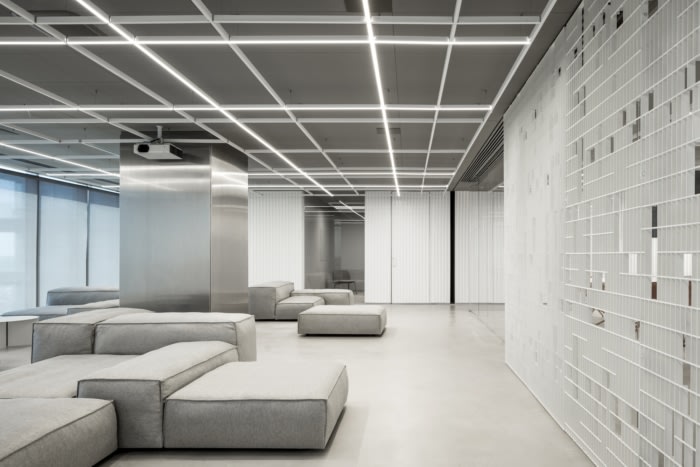 鋼格柵被解開,以創(chuàng)造新的圖案,并從簡單的網(wǎng)格轉(zhuǎn)變?yōu)楣I(yè)蕾絲。這種編織隔墻產(chǎn)生分離而不堵塞空間。這種所謂的交織開放性,使人們能夠?qū)χ車某鞘芯坝^有一個(gè)微妙的、分層的看法。白色波紋聚碳酸酯板被設(shè)計(jì)成一個(gè)更可靠的隔板,以提供更多的隱私。該空間的配色方案全部為白色和灰色,帶有該公司品牌的紅色色調(diào)。材料調(diào)色板結(jié)合了時(shí)尚和工業(yè)——立柱和墻壁的鋁覆層,與混凝土地板和帶有白色油漆飾面的隔墻并列,以及白色波紋聚碳酸酯面板的分裂焊接網(wǎng)格。#濟(jì)南辦公室裝修#