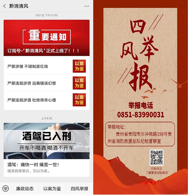 “黔消清風”微信公眾號主要以宣傳政策、傳達上情、案例警示為主,主要設置廉政動態(tài)、以案為鑒、四風舉報功能模塊。該公眾號的開通,為全省消防救援隊伍廣大指戰(zhàn)員及時了解紀檢工作動態(tài)、學習紀檢工作知識,強化提醒告誡筑牢思想防線,開展黨風廉政建設教育提供了一個信息化平臺,切實提升了黨風廉政建設和反腐敗宣傳的針對性和實效性。結(jié)合當前正在開展的專項整治活動,公眾號先后推送了“涉賭涉貸問題案例警示”、“酒駕:痛快一時,痛苦一世”2期信息,取得了明顯成效。下一步,省消防救援總隊紀委將在推動微信公眾號功能日趨完善的基礎上,使其成為及時傳遞黨風廉政建設和反腐敗工作最新動態(tài),宣傳紀檢工作的新陣地,打造“互聯(lián)網(wǎng)+紀檢”的新平臺。