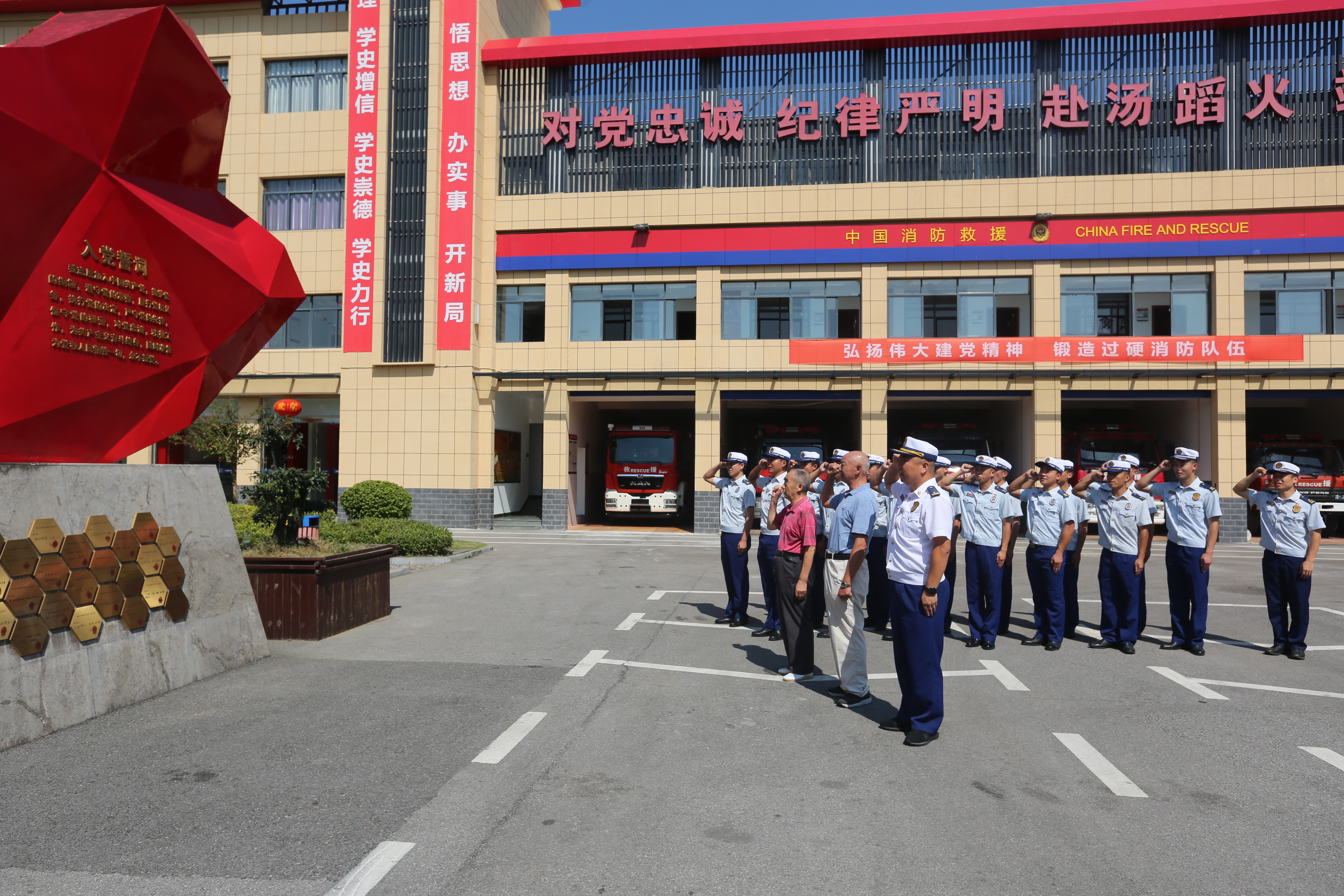 “我宣誓,我志愿加入中國共產(chǎn)黨,維護(hù)黨的綱領(lǐng)……”全體黨員在首任指導(dǎo)員雷克己的帶領(lǐng)下,高舉右拳重溫入黨誓詞,神情莊重、聲音鏗鏘有力。參與此次活動的指戰(zhàn)員紛紛表示,通過重溫入黨誓詞,再一次體會到作為一名共產(chǎn)黨員的責(zé)任感和使命感。兩位老人勉勵全體指戰(zhàn)員,牢記消防隊(duì)伍艱難發(fā)展歷程,傳承發(fā)揚(yáng)優(yōu)良作風(fēng),爭當(dāng)黨和人民神圣守夜人。