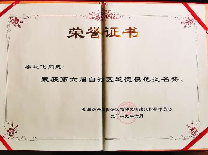 2019年6月,第六屆新疆維吾爾自治區(qū)道德模范和提名獎(jiǎng)獲得者名單揭曉,新疆維吾爾自治區(qū)消防救援總隊(duì)阿克蘇支隊(duì)庫(kù)車(chē)縣大隊(duì)開(kāi)發(fā)區(qū)中隊(duì)政治指導(dǎo)員李運(yùn)飛榮獲第六屆“自治區(qū)道德模范提名獎(jiǎng)”。