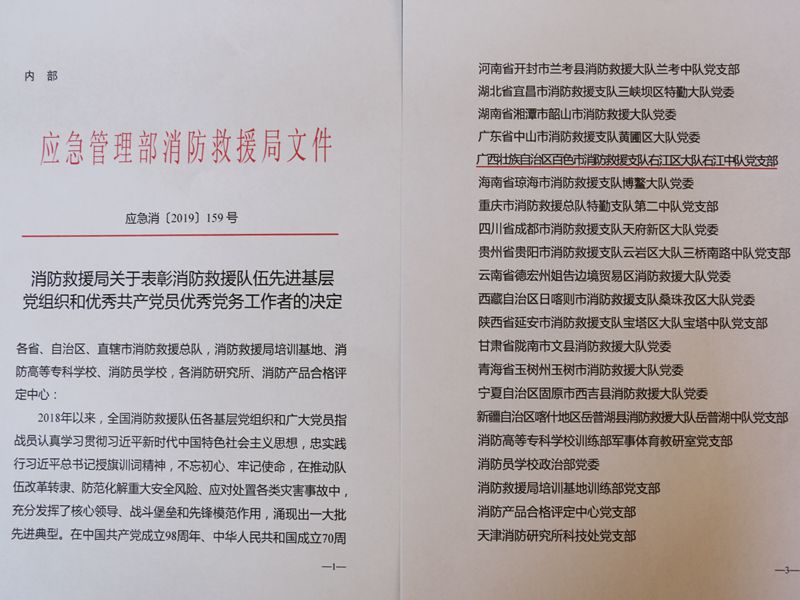 2019年7月1日,在慶祝中國共產(chǎn)黨成立98周年之際,國家消防救援局黨委通報表彰了一批發(fā)揮核心領(lǐng)導(dǎo)、戰(zhàn)斗堡壘和先鋒模范作用的先進(jìn)基層黨組織和優(yōu)秀共產(chǎn)黨員。廣西壯族自治區(qū)百色市消防救援支隊右江區(qū)大隊右江中隊黨支部,憑借優(yōu)秀的黨建工作特色被表彰為“消防救援局先進(jìn)基層黨組織”。百色市消防救援支隊右江中隊成立于1965年12月,原為百色公安消防隊,1983年改為中國人民武裝警察部隊百色縣中隊,1984年改為百色地區(qū)消防中隊,2002年百色撤地改市后改為右江區(qū)消防中隊,是鄧小平同志領(lǐng)導(dǎo)百色起義的革命圣地,是自治區(qū)政協(xié)副主席、百色市委書記彭曉春同志掛點單位。