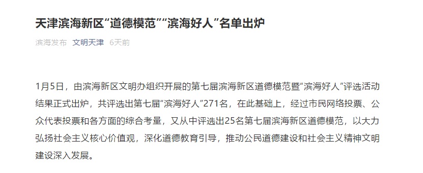 一年一度的“濱海好人”評(píng)選活動(dòng)是新區(qū)培樹身邊優(yōu)秀典型、學(xué)習(xí)和表彰凡人善舉的重要舉措,每年獲獎(jiǎng)?wù)叨际窃谏锨扑]者中經(jīng)過(guò)層層篩選才能脫穎而出。此項(xiàng)評(píng)選旨在通過(guò)在身邊的群眾中推薦好人,在日常生活中發(fā)現(xiàn)好事,大力弘揚(yáng)中華傳統(tǒng)美德,切實(shí)推進(jìn)全區(qū)公民思想道德建設(shè),為全面建設(shè)美麗濱海提供精神動(dòng)力和思想保證。