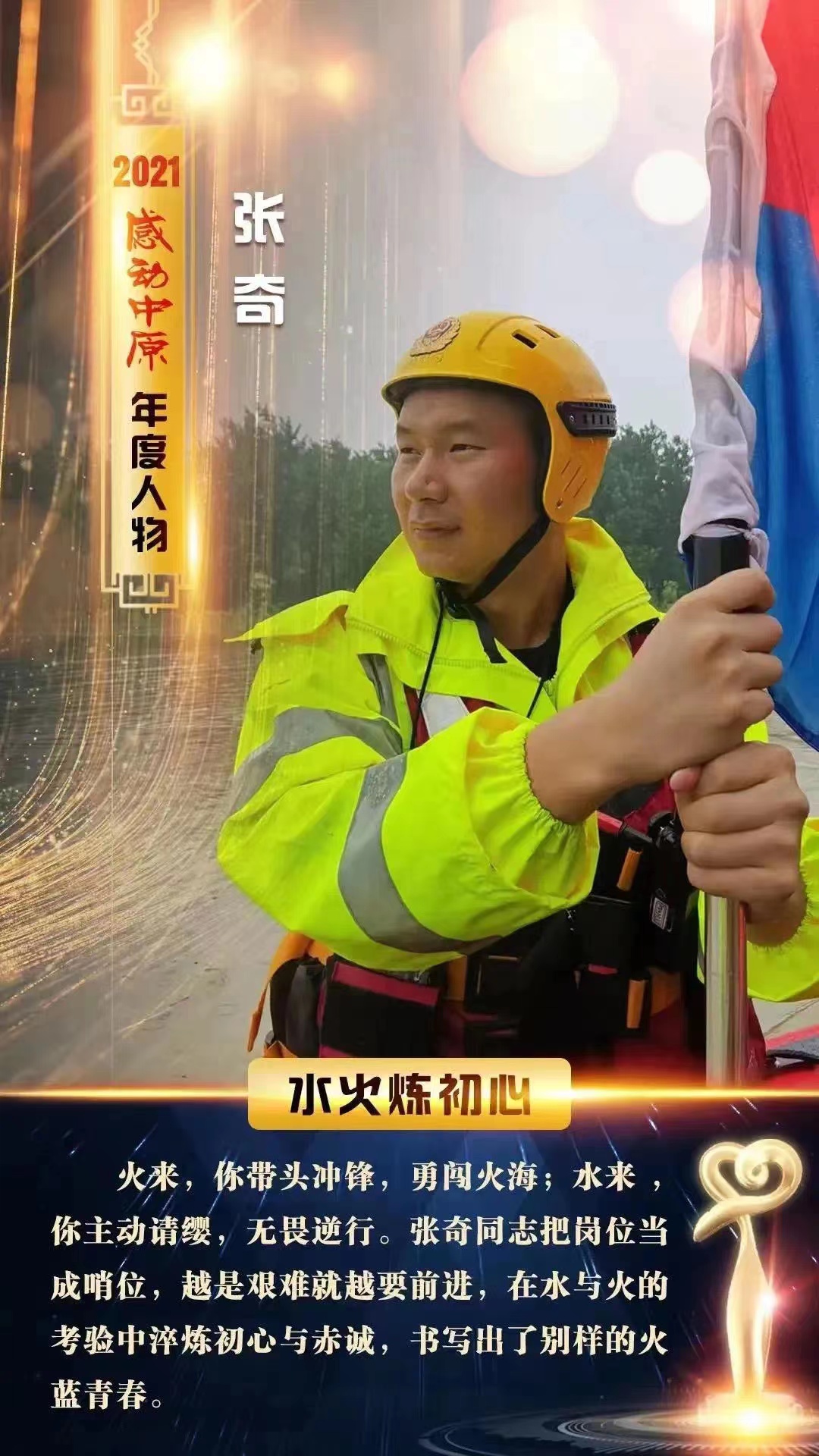 “火來,你帶頭沖鋒,勇闖火海;水來,你主動請纓,無畏逆行。張奇同志把崗位當(dāng)成哨位,越是艱難就越要前進(jìn),在水與火的考驗中淬煉初心與赤誠,書寫出了別樣的火藍(lán)青春?!边@是“出彩河南人”2021感動中原年度人物頒獎儀式上授予張奇的頒獎詞,既是對他赴湯蹈火、履行職責(zé)使命的精彩詮釋,更是對他竭誠為民、書寫別樣青春的生動寫照。