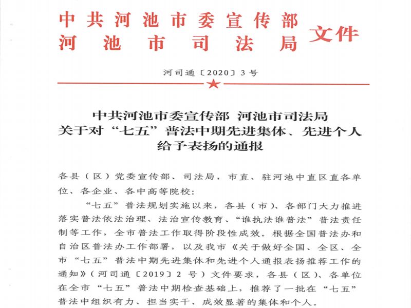 近日,中共河池市委宣傳部、河池市司法局聯(lián)合下發(fā)《關(guān)于對(duì)“七五”普法中期先進(jìn)集體、先進(jìn)個(gè)人給予表揚(yáng)的通報(bào)》,對(duì)全市“七五”普法規(guī)劃實(shí)施以來涌現(xiàn)出的先進(jìn)集體和先進(jìn)個(gè)人予以表彰。河池支隊(duì)被評(píng)為全市“七五”普法中期先進(jìn)集體,防火監(jiān)督處助理工程師譚文琦被評(píng)為全市“七五”普法中期先進(jìn)個(gè)人。