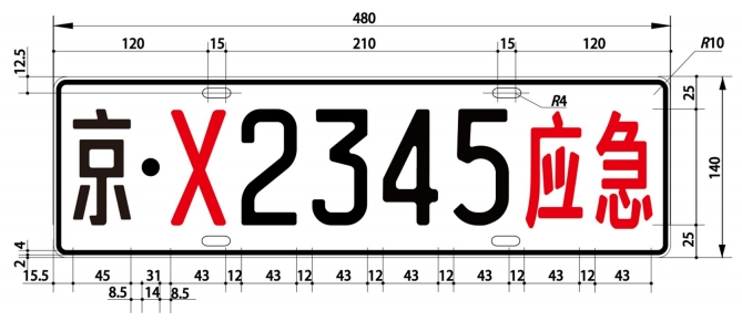 汽車號牌規(guī)格為480毫米×140毫米,摩托車號牌規(guī)格為220毫米×140毫米。