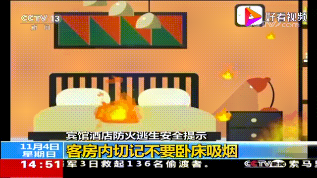 客房內(nèi)切記不要臥床吸煙。煙頭雖小,其中心溫度卻可達700度左右,房間內(nèi)的大量可燃物,如床單、被罩、地毯等燃點都在150度到350度之間,很容易被煙頭引燃從而引火上身。