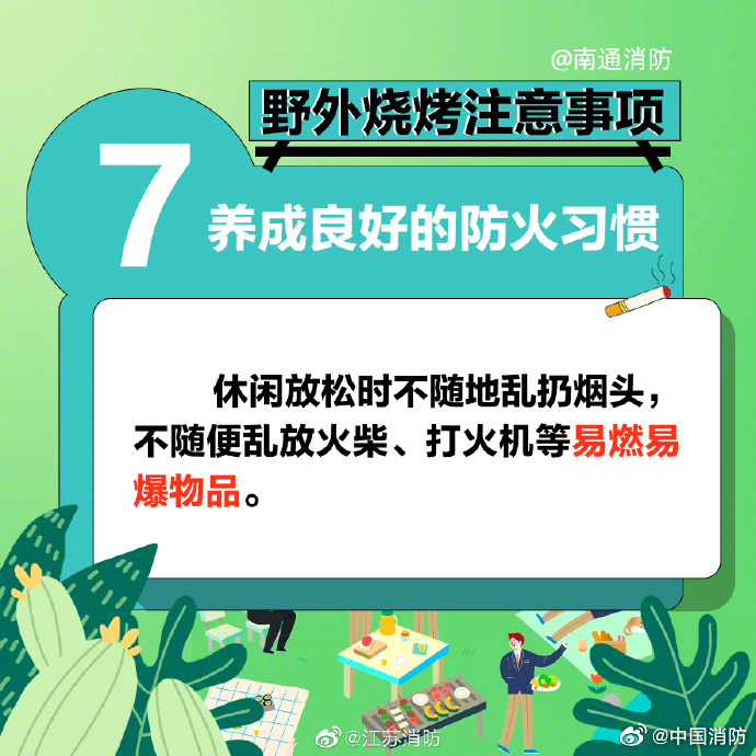 戶外露營(yíng)搭配炭火燒烤,享受這份閑適與愜意時(shí),千萬(wàn)要注意用火安全哦。燒烤場(chǎng)地選擇要謹(jǐn)慎、勿忘攜帶小型滅火設(shè)備、用火結(jié)束及時(shí)熄滅火種……這些都是頂要緊的事,看圖~