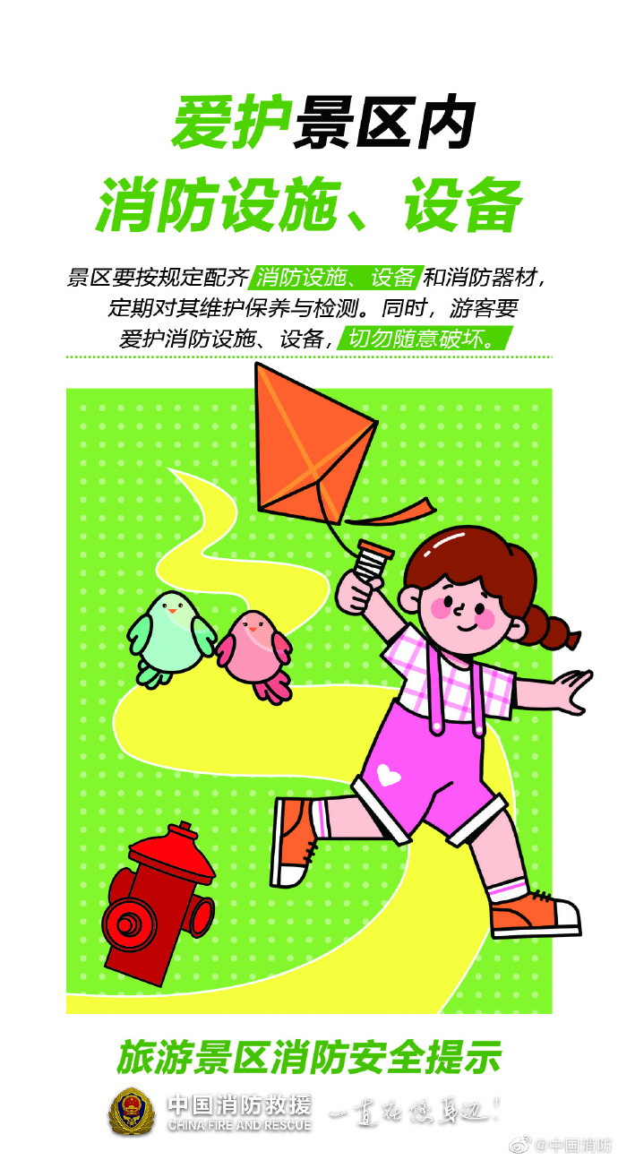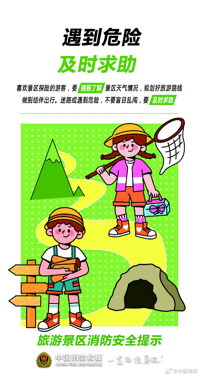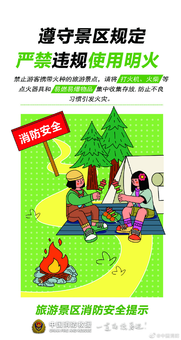 假期出行景區(qū)游玩時,要時刻注意消防安全,易燃易爆品不能帶進景區(qū),嚴(yán)禁違規(guī)使用明火,車輛按規(guī)定停放切勿擋住消防通道......藍(lán)朋友準(zhǔn)備了這份景區(qū)提醒,戳圖看吧~