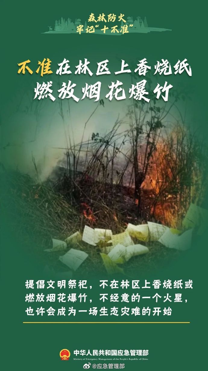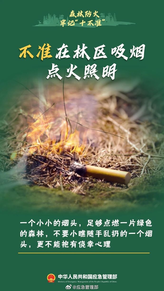 秋季天干物燥,森林里枯樹、落葉等可燃物較多,稍有不慎就有可能引發(fā)森林火災。不攜帶火種進山、不在野外燒火取暖、不煉山、不燒荒、不在林區(qū)上香燒紙…進入森林,千萬不要做這十件事↓↓