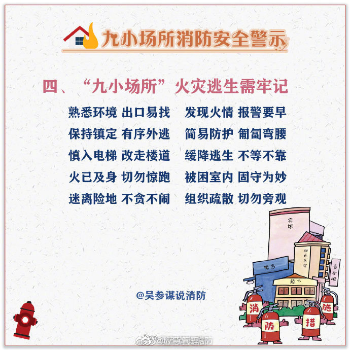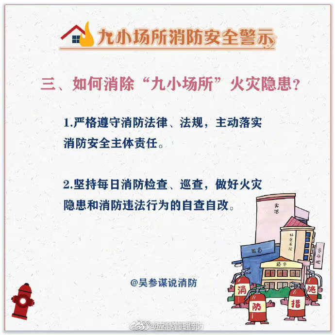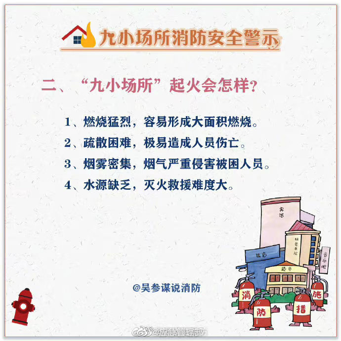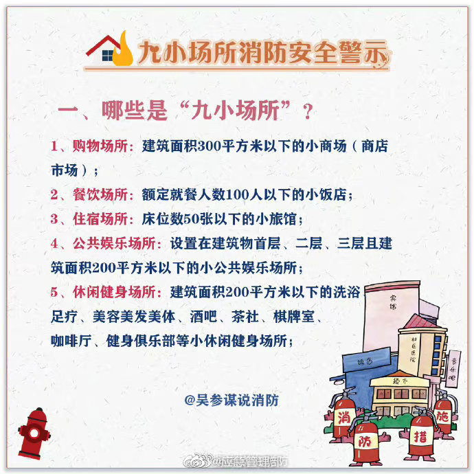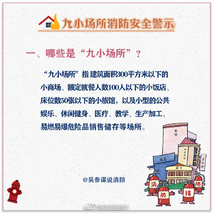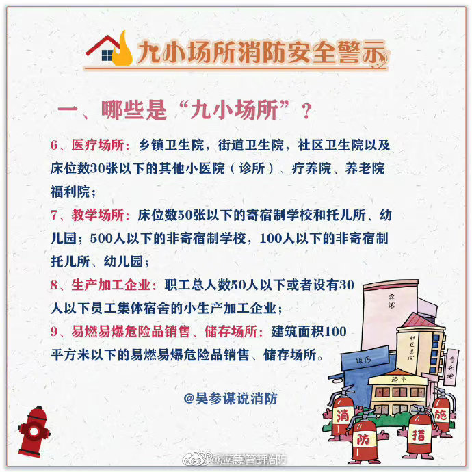 午托班、小旅館、小網(wǎng)吧、小作坊……“九小場所”不是一個單純的數(shù)字名詞概念,而是小型人員密集場所的代名詞,這些場所由于人員密集流動性大,往往存在很大的消防隱患。這些消防常識戳圖了解↓↓