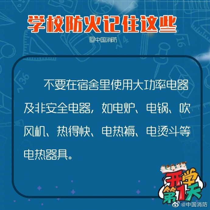 學(xué)校是人員密集場所,宿舍實(shí)驗(yàn)室等重點(diǎn)部位要注意防火安全,尤其是住宿舍的同學(xué)切不可使用大功率電器哦,安全放在心中!