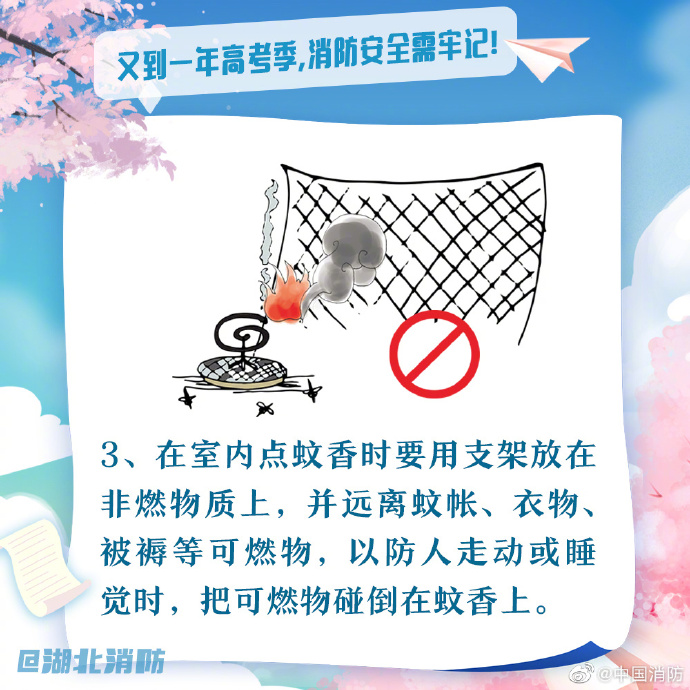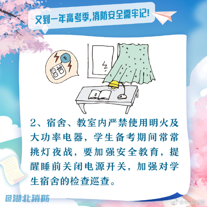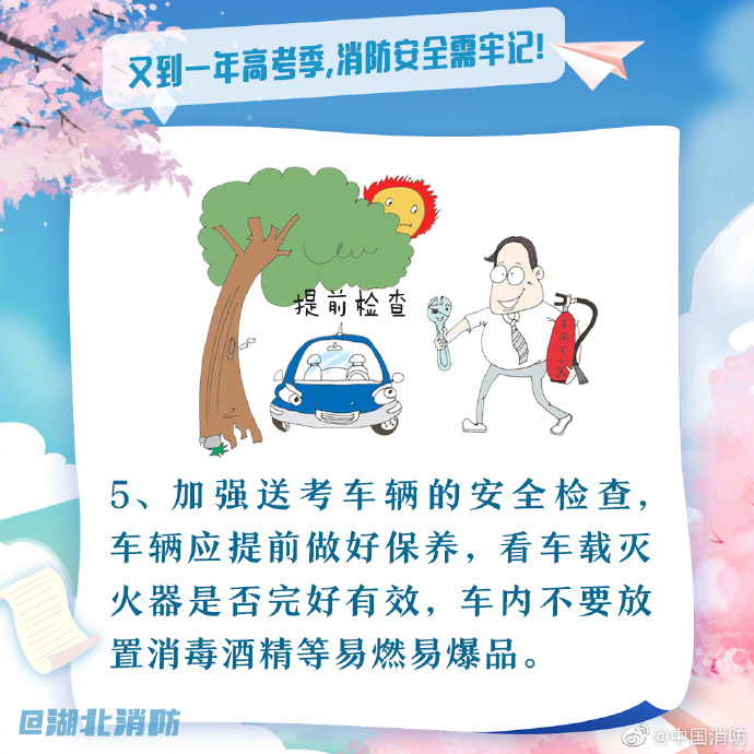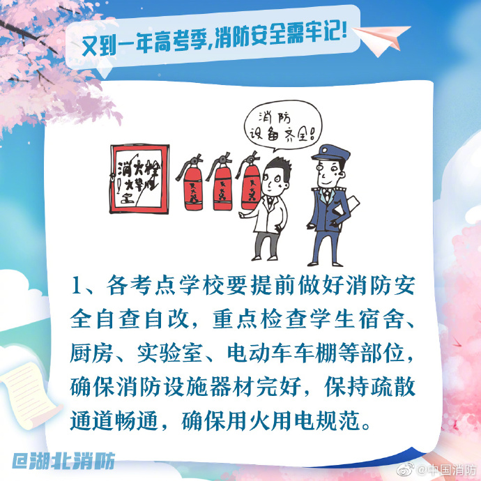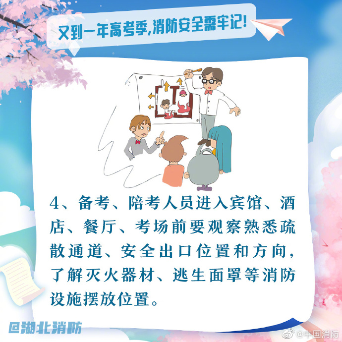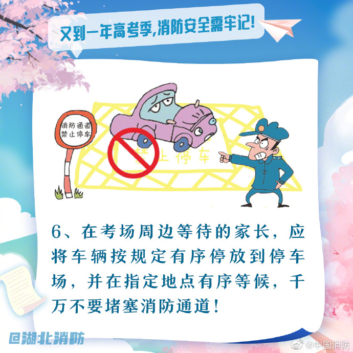 一年一度的高考來臨,為了讓考生們順利度過高考,學(xué)校和家長應(yīng)該提高安全意識,牢記這些消防安全知識!祝愿考生們旗開得勝,金榜題名!