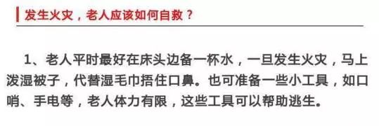 平時應(yīng)多講解家中用火、用電以及吸煙、點蚊香等的火災(zāi)危害性,加強老人的火災(zāi)防范意識;要告知老人發(fā)生火災(zāi)時,切忌貪戀財物,不要盲目救火,應(yīng)迅速逃生自救,并及時撥打119報警。