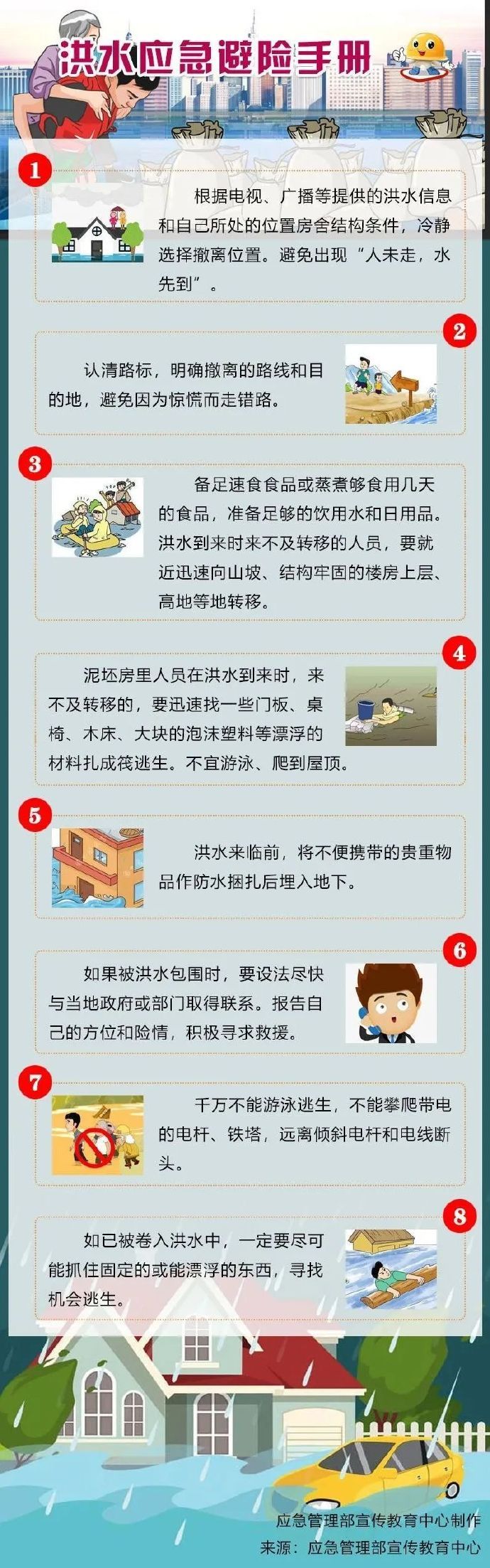 汛期到來,若遭遇洪水,掌握科學(xué)的應(yīng)急避險(xiǎn)方法至關(guān)重要。來不及轉(zhuǎn)移或在外被困時(shí)該如何自救?被卷入洪水中該如何逃生?戳圖了解~