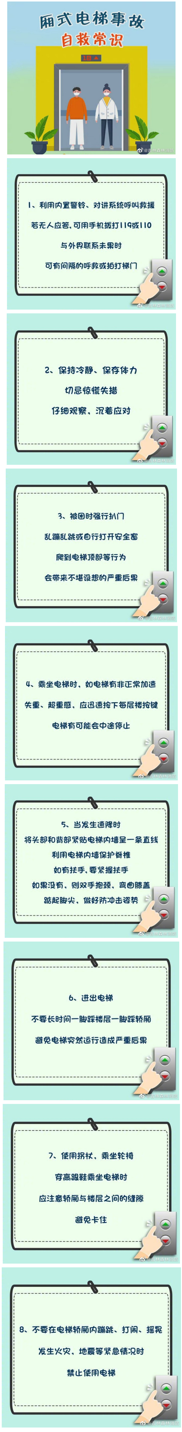 隨著城市建設(shè)的迅猛發(fā)展,高樓越來(lái)越多,廂式電梯已經(jīng)成為高樓大廈的標(biāo)配,帶給人們出行便利的同時(shí),如果因乘坐或操作不當(dāng)也會(huì)存在一些安全隱患。如:突然沖頂或墜落,打不開門等。如果遇到類似情形事故,你知道如何自救嗎?