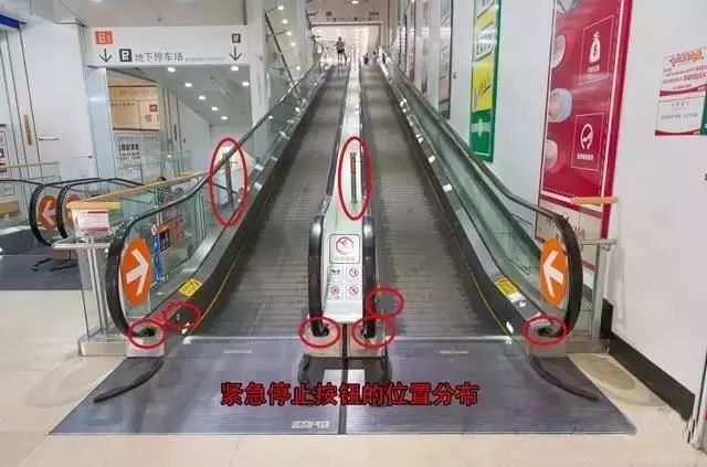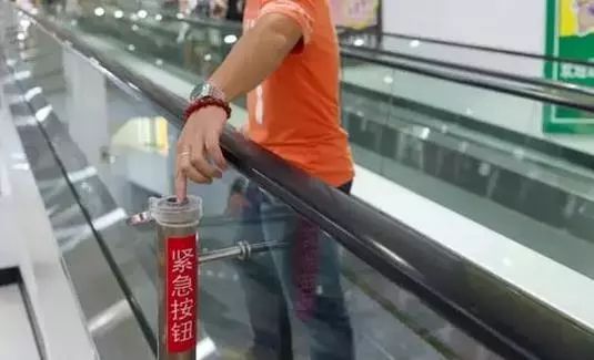 每個電動扶梯都配有緊急按鈕,一般在電梯進口處靠近地面的地方,有一個紅色緊急制動按鈕。
