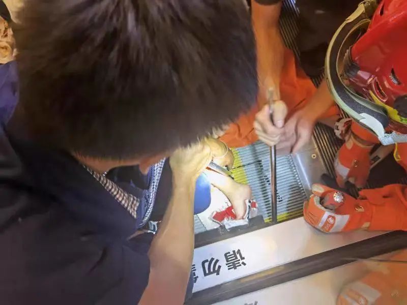 經(jīng)過了解,被卡的是一位5歲左右的小男孩,其右腳前腳掌被卡在扶梯縫隙中間,由于受擠壓的時間過長,血流不暢,右腳已經(jīng)出現(xiàn)輕微腫脹。