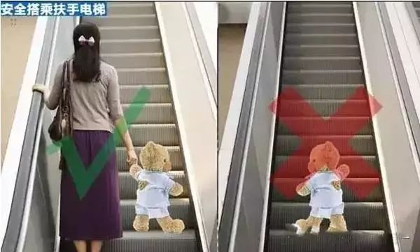 孩子搭扶梯時,一定要有大人陪同,最好是讓孩子站在前方或者旁邊,并且牽著手,如果發(fā)生意外能夠及時應(yīng)對。