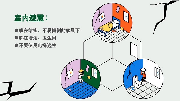 在家中,就近躲在結(jié)實、不易傾倒的家具下面,或躲在墻角、衛(wèi)生間,不要使用電梯逃生。