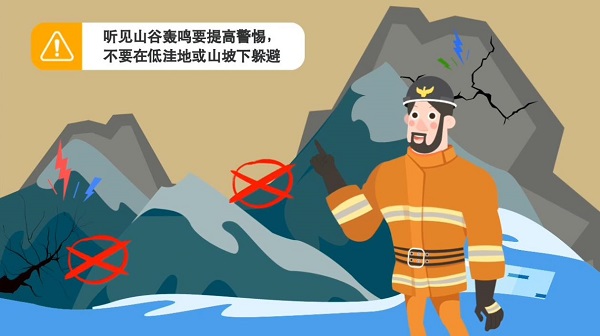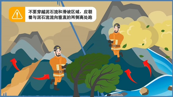 聽見山谷轟鳴要提高警惕,不要在低洼地或山坡下躲避,不要穿越泥石流和滑坡區(qū)域,應朝著與泥石流流向垂直的兩側(cè)高處跑。
