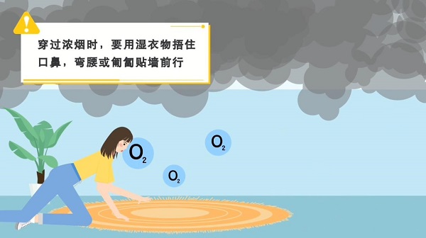 穿過濃煙時,要用濕衣物捂住口鼻,彎腰或匍匐貼墻前行。