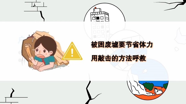 在戶外,要躲開建筑物、橋梁或山坡,尋找空曠的安全地點。被困廢墟要節(jié)省體力,用敲擊的方法呼救。