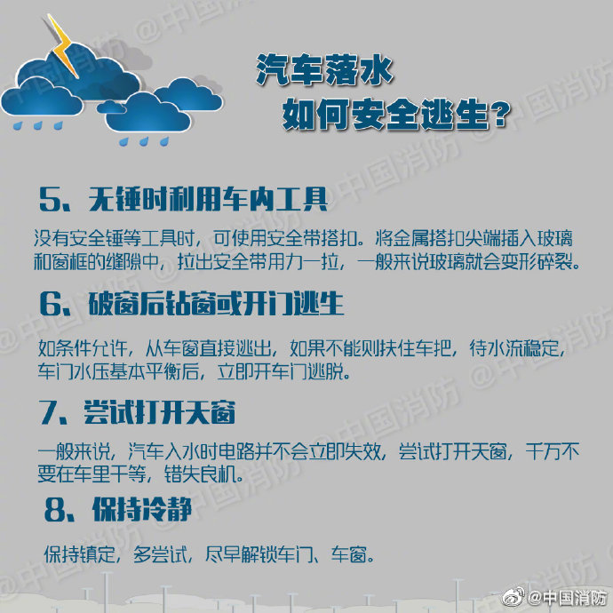 夏季暴雨多,來了怎么做,若不幸遇險(xiǎn),該如何自救,汽車落水,又要怎樣逃生?戳圖了解~