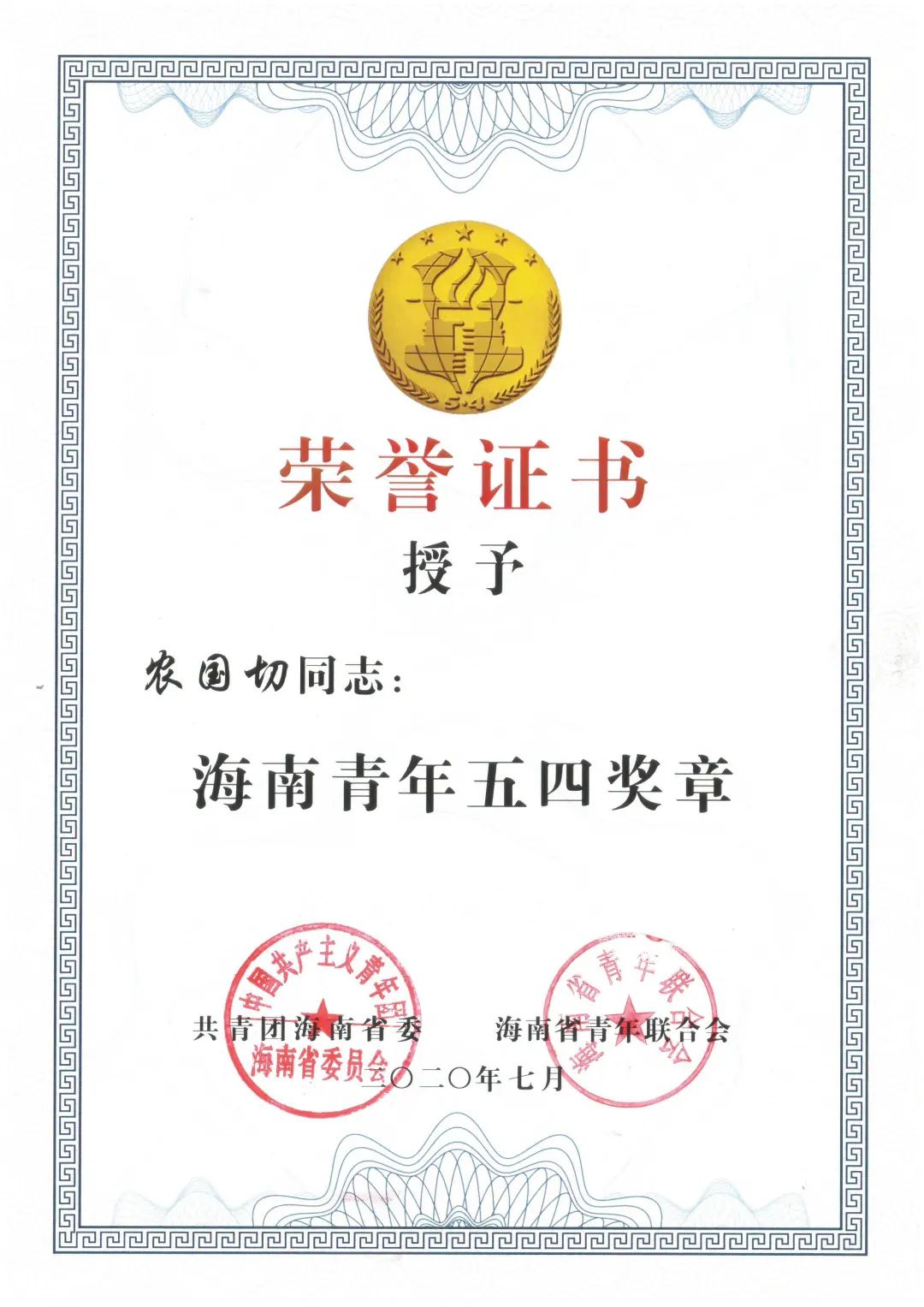 圖丨2020年榮獲“海南青年五四獎?wù)隆?/p>