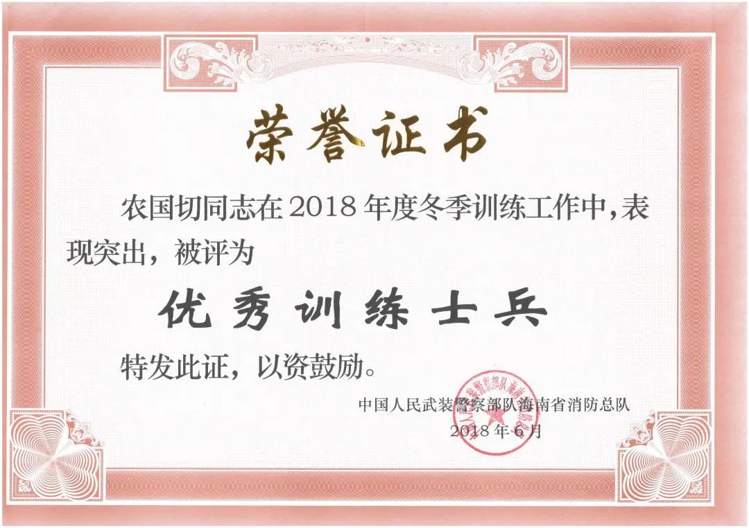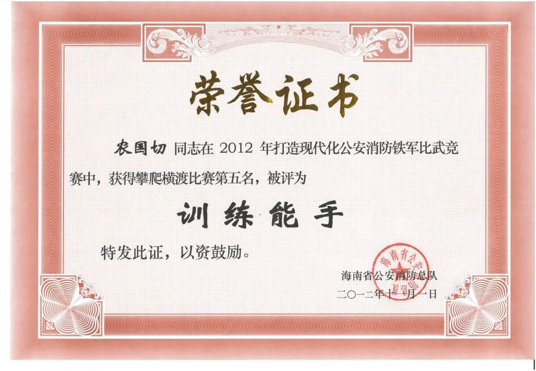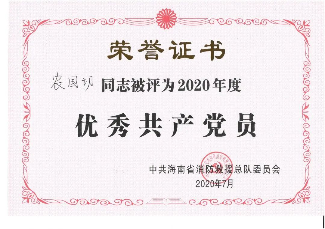 參加工作11年以來,農(nóng)國切同志歷任副班長、班長、中隊長助理,從戰(zhàn)斗員到分隊長,始終堅持戰(zhàn)斗在消防救援第一線,先后榮立二等功1次、三等功1次,獲得 “優(yōu)秀共產(chǎn)黨員”“優(yōu)秀共青團員”“海南青年五四獎?wù)隆薄坝?xùn)練能手”等榮譽。并于2020年獲第五屆全國119消防先進個人。