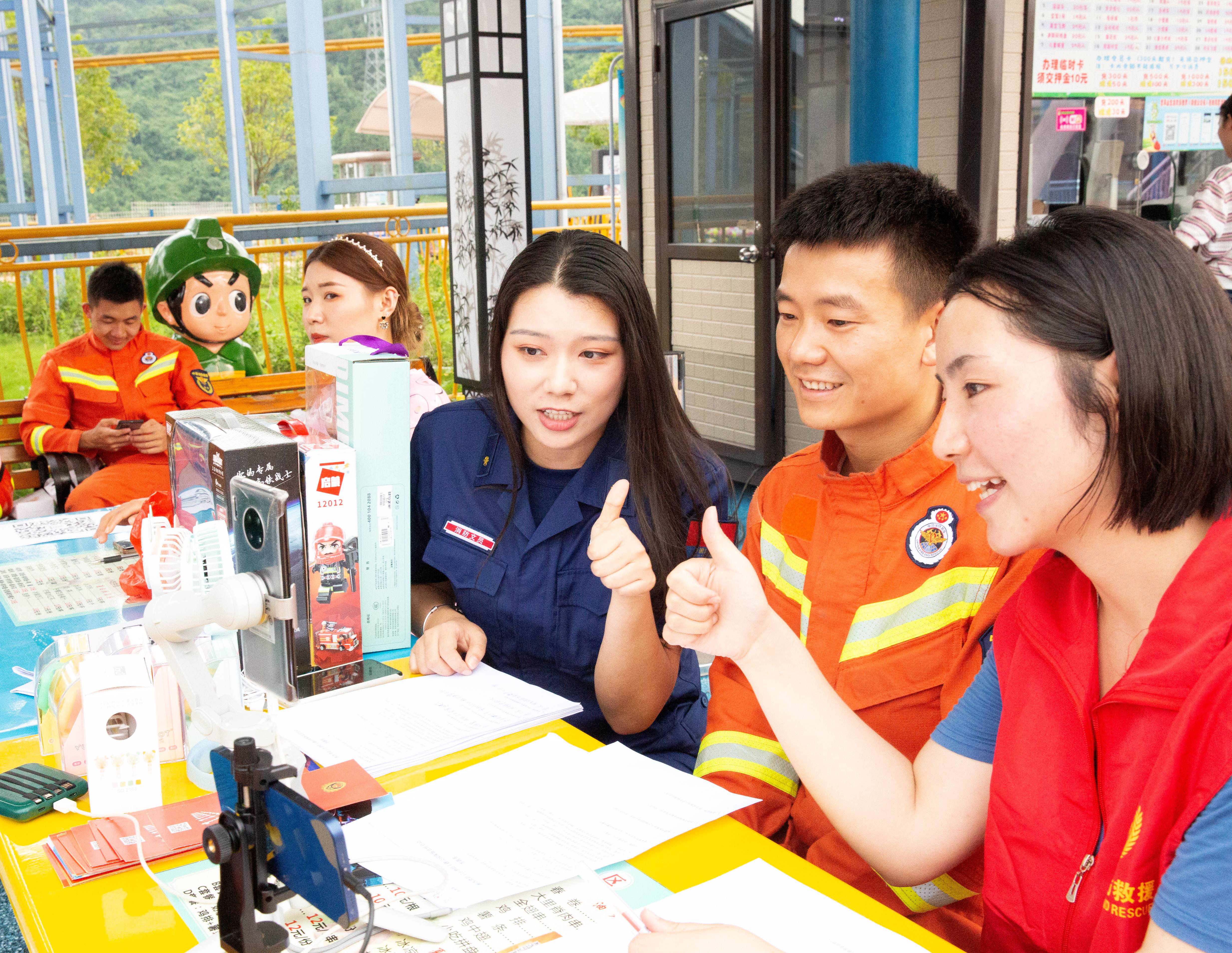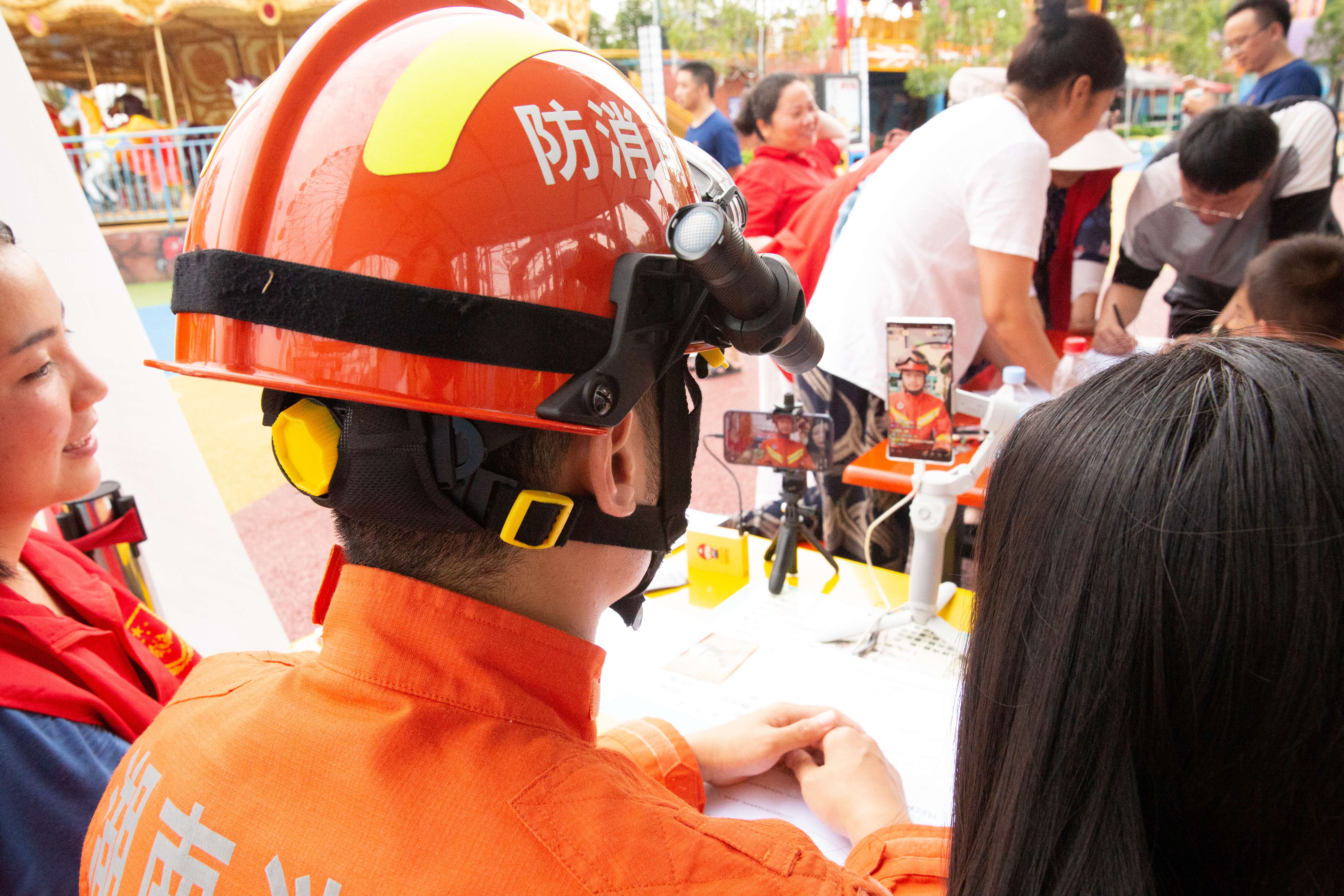 線上活動正酣,線下活動隨之展開。活動開始不到半小時,展臺前已成為主題公園內(nèi)人氣最旺之地。在現(xiàn)場消防志愿者引導(dǎo)下,大朋友和小朋友爭相作答消防安全試題、體驗消防器材,在學(xué)習(xí)玩樂之余還能領(lǐng)取精美禮品、免費暢玩游樂設(shè)施。同時,消防志愿者巧借時機,穿梭在人群中,向群眾分發(fā)宣傳手冊傳播消防安全知識。