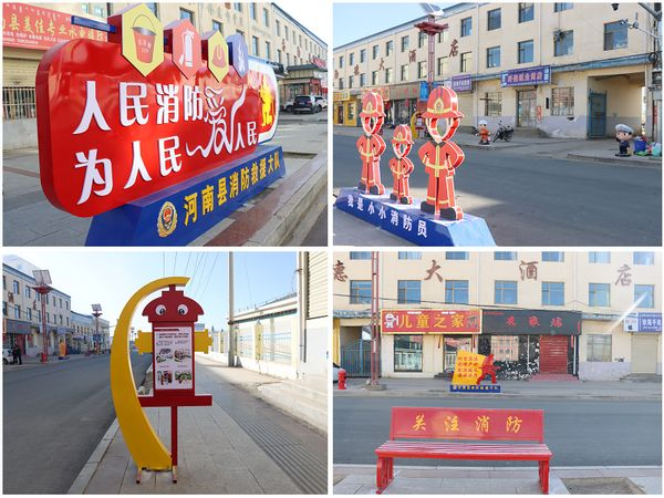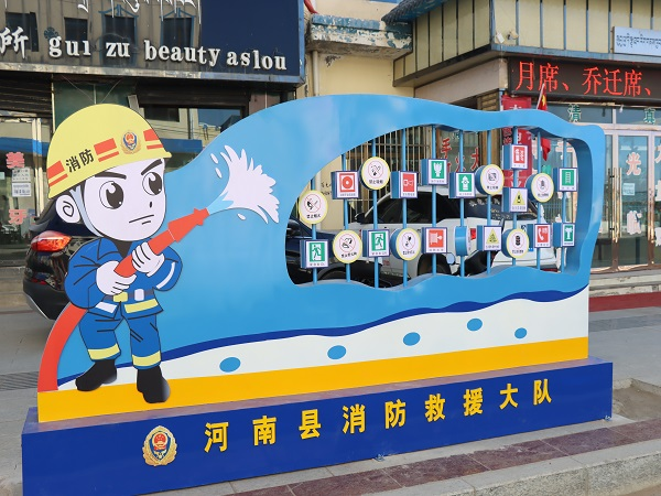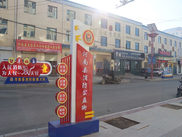 此消防主題公益街建于有“河南蒙旗”之稱的河南蒙古族自治縣,它是中國蒙古族人口比例最高的縣,平均海拔3600米,處于青甘川三省結(jié)合部,素有青海省南大門之稱。而消防主題街道又選址于河南縣和碩特南路,是居民休閑聚集地以及學(xué)生放學(xué)后的必經(jīng)路,東西長140米。經(jīng)多次溝通協(xié)調(diào)有關(guān)部門,擇優(yōu)選定了4個點位作為固定消防宣傳版面設(shè)置地點。消防主題街區(qū)根據(jù)街道實際,分為兩大塊消防內(nèi)容。其中,消防宣傳內(nèi)容涵蓋消防安全常識20條、家庭安全用火用電常識、兒童防火常識、電動自行車火災(zāi)案例、消防法律法規(guī)知識、消防通道消防安全提示等。在形式上,在消防公益街道路兩旁分別設(shè)置有小小消防員卡通圖案供群眾觀賞拍照使用;消防主題座椅給群眾提供休息便利的同時又營造了濃厚的消防安全氛圍。消火栓造型的公益設(shè)施時刻提醒人民群眾勿忘消防安全,消防卡通玩偶,直觀醒目的吸引著過往群眾的眼球,使大家在休閑散步之余就能學(xué)習(xí)到實用的消防知識。