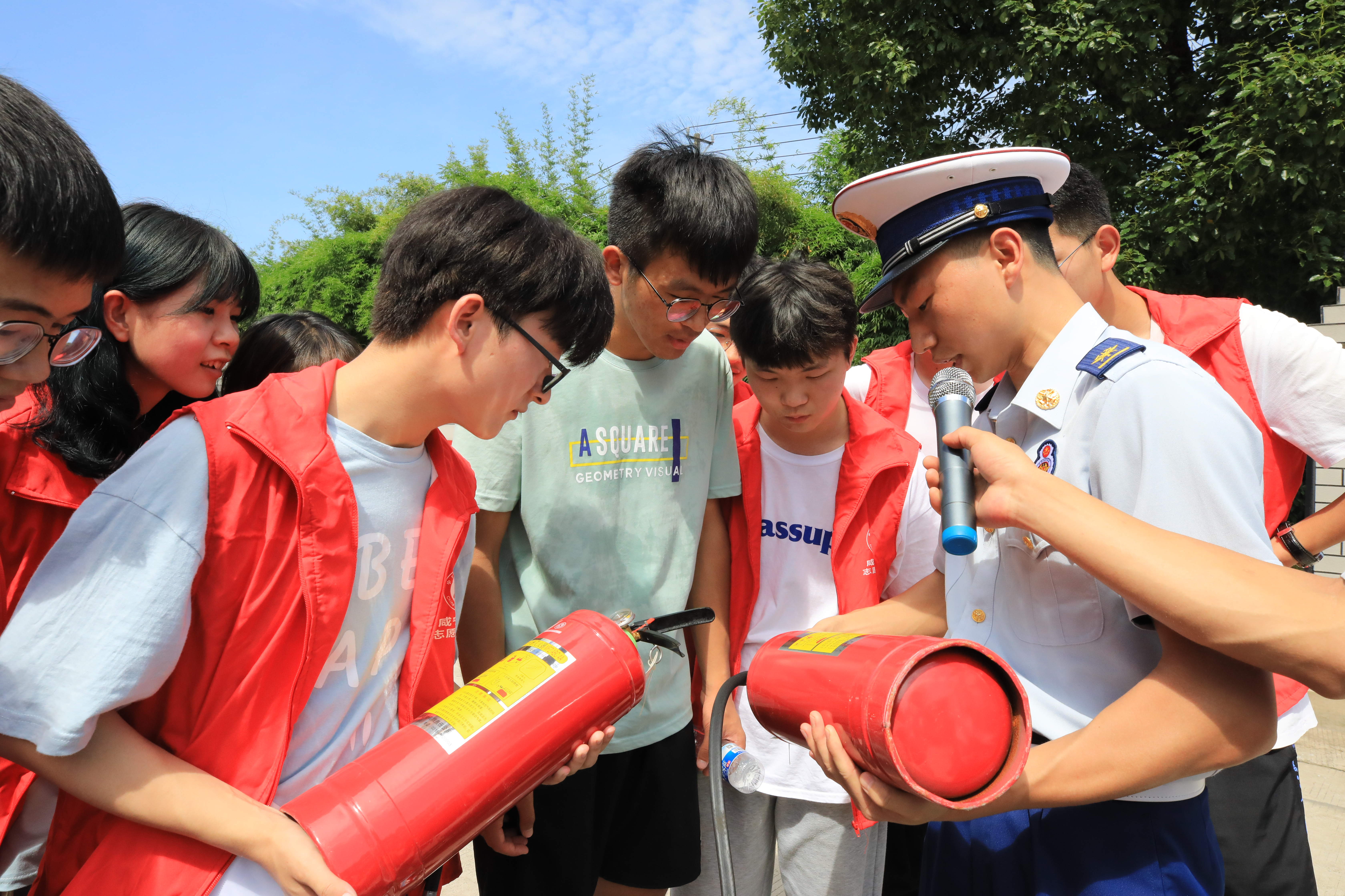 “這個紅外線熱感應器在火場中搜救被困群眾發(fā)揮了很大的作用,我們就是用這些儀器發(fā)現被困群眾的……”在消防指戰(zhàn)員的帶領下,志愿者們參觀了消防車輛器材,十幾種消防器材裝備一字排開,講解人員就液壓機動泵、空呼、無齒鋸、紅外線熱感應器等10余種消防器材的功能及工作原理進行了詳細講解。講解人員一邊介紹,一邊就器材進行現場演示,同學們也爭先恐后的在消防指戰(zhàn)員的帶領下進行了消防器材設施滅火體驗。