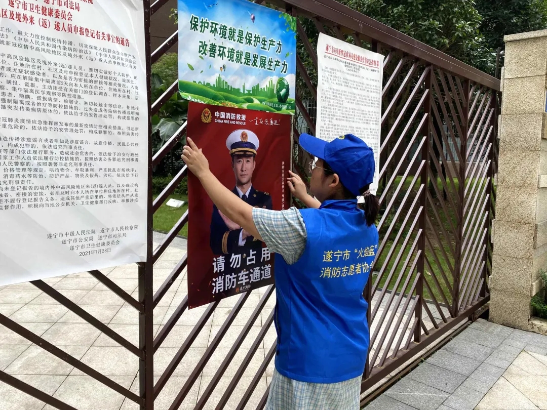 張貼海報造氛圍。上午9時,支隊宣傳人員與消防志愿者組成宣傳方隊深入高新區(qū)多個住宅小區(qū),在各小區(qū)內(nèi)醒目位置張貼“請勿占用消防車通道”的宣傳海報,時刻提醒居民消防車通道嚴禁占用。