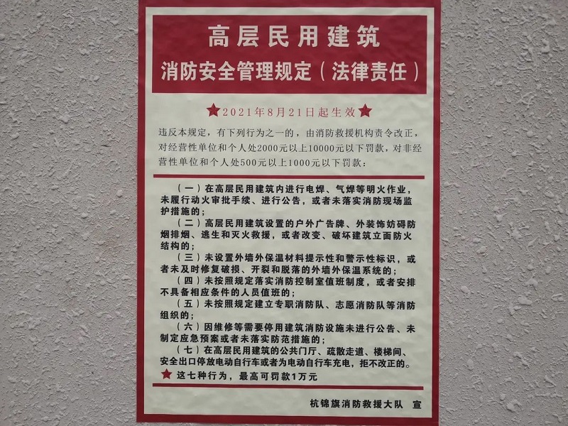為深入推進(jìn)黨史學(xué)習(xí)教育,持續(xù)開展“我為群眾辦實(shí)事”實(shí)踐活動(dòng),認(rèn)真宣貫《高層民用建筑消防安全管理規(guī)定》,堅(jiān)決遏制高層建筑火災(zāi)事故發(fā)生,不斷提高廣大居民的消防安全意識(shí),近日,內(nèi)蒙古自治區(qū)鄂爾多斯市消防救援支隊(duì)杭錦旗消防救援大隊(duì)深入轄區(qū)各高層住宅小區(qū)開展高層建筑消防安全海報(bào)張貼宣傳活動(dòng)。