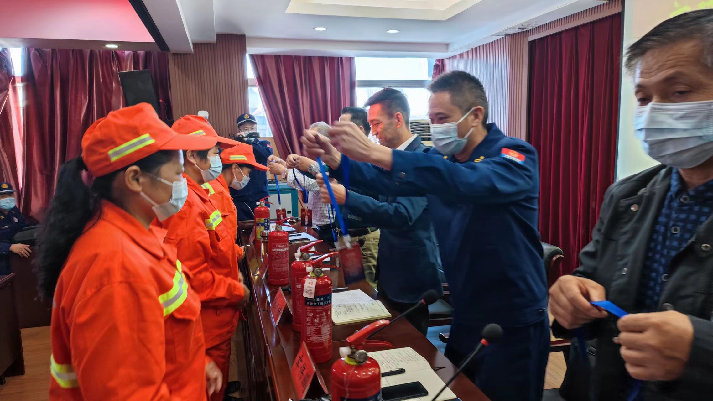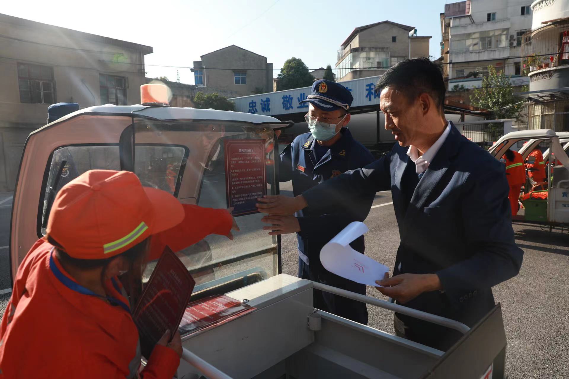 成立儀式上,黃岡市消防救援支隊副支隊長為環(huán)衛(wèi)消防志愿服務隊授予了隊旗,為一線職工代表佩戴了消防志愿者胸牌、發(fā)放了隨車滅火器,并向現(xiàn)場消防志愿者做了動員講話,感謝他們?nèi)粘9ぷ髦械男燎诟冻觯M恳幻驹阜贞牫蓡T要當好“隱患搜集員”“消防宣傳員”“火災監(jiān)控員”“平安守護員”,為全市消防工作貢獻自身力量。隨后,支隊宣傳員組織參會人員注冊了全民消防學習平臺,觀看了消防安全警示教育片,培訓了干粉滅火器的使用方法,并將印有消防安全常識的宣傳海報張貼在各自保潔作業(yè)車的顯著位置。