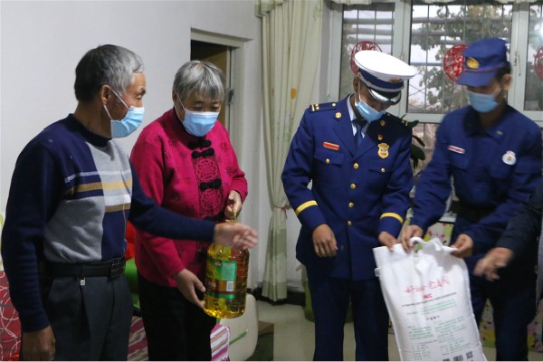 重陽慰問送溫情 濃濃關(guān)懷暖人心?!敖裉煜狸犘』镒雍拖乐驹刚邅淼轿壹?,給我們送上了米、面、油,還不嫌棄我們,給我和老伴修剪指甲、收拾衛(wèi)生、排查家庭消防安全隱患,我感到很幸福也很暖心?!?
