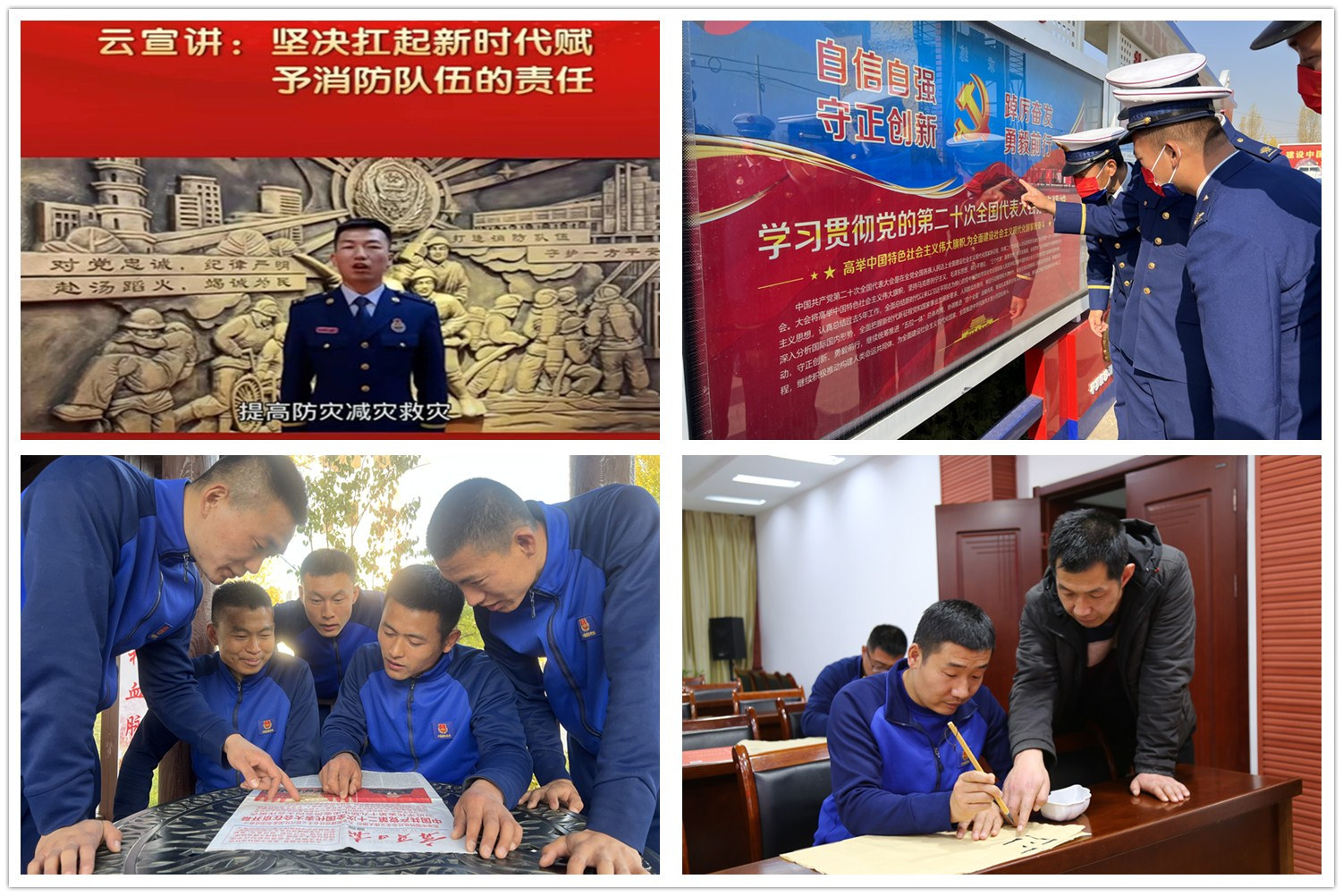 多層次活動形式新。隊(duì)伍各級廣泛開展“學(xué)習(xí)黨的二十大、踔厲奮發(fā)新征程、永做忠誠守夜人”知識競賽,充分檢驗(yàn)廣大指戰(zhàn)員對黨的二十大精神相關(guān)內(nèi)容的理解掌握情況。依托營區(qū)基礎(chǔ)文化設(shè)施和“藍(lán)焰書院”文化教育特色品牌,定制安裝黨的二十大櫥窗展板、制作黨的二十大報(bào)告思維導(dǎo)圖,邀請書法家進(jìn)營區(qū)開展“獻(xiàn)禮二十大·翰墨頌黨恩”主題黨日活動,助推“手寫二十大報(bào)告金句”活動提檔升級。2022年度新招錄消防員入職教育訓(xùn)練集訓(xùn)大隊(duì)結(jié)合作戰(zhàn)訓(xùn)練、思想政治教育、隊(duì)伍管理及安全防事故等工作實(shí)際,開展“學(xué)思踐悟二十大 勾勒美好火焰藍(lán)”黑板報(bào)展評活動,傳承發(fā)揚(yáng)“四會教員”優(yōu)良傳統(tǒng),助推新訓(xùn)工作再上新臺階。
