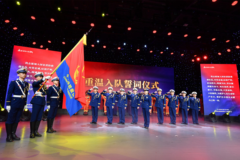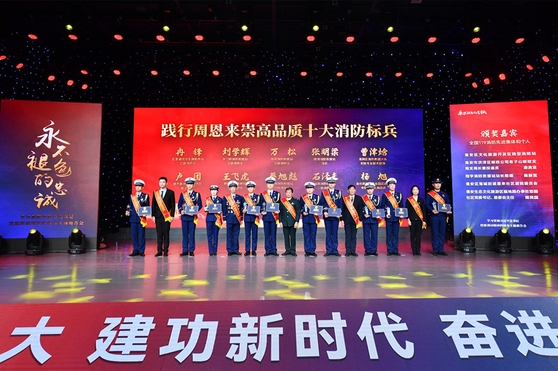 第一篇章《傳承?我們的光輝歲月》以紅色為主基調(diào),回顧了新中國成立以來消防隊伍改革發(fā)展歷程;主題講述《軍帽的故事》,現(xiàn)場還原了消防員為95歲抗戰(zhàn)老兵尋找軍帽的感人故事,展現(xiàn)出隊伍傳承紅色基因的使命擔當;音樂快板《高擎隊旗永向前》講述了支隊改革轉(zhuǎn)制四年來的工作成果和昂揚的精神風貌。黨的二十大代表鄧紅、李銀江,以及周恩來同志親屬、生前身邊工作人員周秉德、高振普,淮安消防轉(zhuǎn)業(yè)干部代表周懷仁、宋劍峰通過視頻的方式,寄語消防員,表達殷殷祝福。