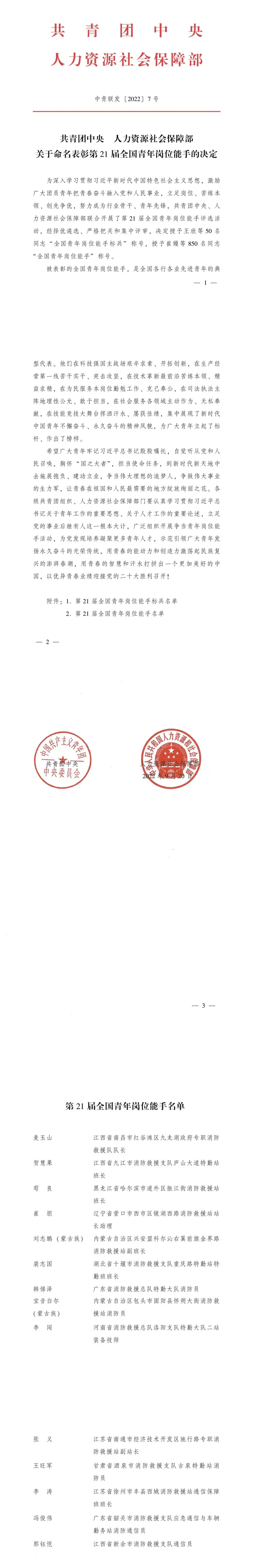9月20日,共青團(tuán)中央、人力資源社會(huì)保障部聯(lián)合印發(fā)《關(guān)于命名表彰第21屆全國青年崗位能手的決定》,參加全國首屆消防行業(yè)職業(yè)技能大賽的14名消防員(單項(xiàng)前3名)被授予“全國青年崗位能手”稱號(hào),這是繼其中5名消防員(單項(xiàng)第1名)榮獲“全國五一勞動(dòng)獎(jiǎng)?wù)隆焙螅忠粐壹?jí)榮譽(yù)獎(jiǎng)項(xiàng)落實(shí)落地。