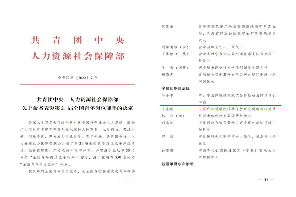 9月20日,共青團中央、人力資源和社會保障部聯(lián)合印發(fā)《關(guān)于命名表彰第21屆全國青年崗位能手的決定》,授予50名同志“全國青年崗位能手標(biāo)兵”稱號,授予850名同志“全國青年崗位能手”稱號。寧夏消防救援總隊中衛(wèi)支隊文昌特勤站站長助理馬小平同志被授予“全國青年崗位能手”稱號。