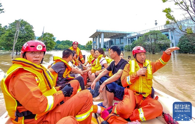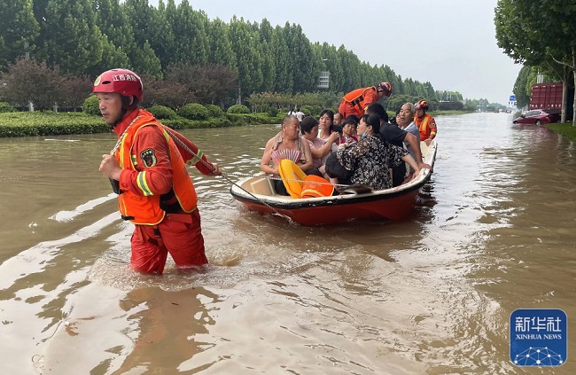 在河南省鄭州市中牟縣,李勝利(右一)在疏散被困群眾(2021年7月22日攝)。新華社發(fā)(田聰 攝)