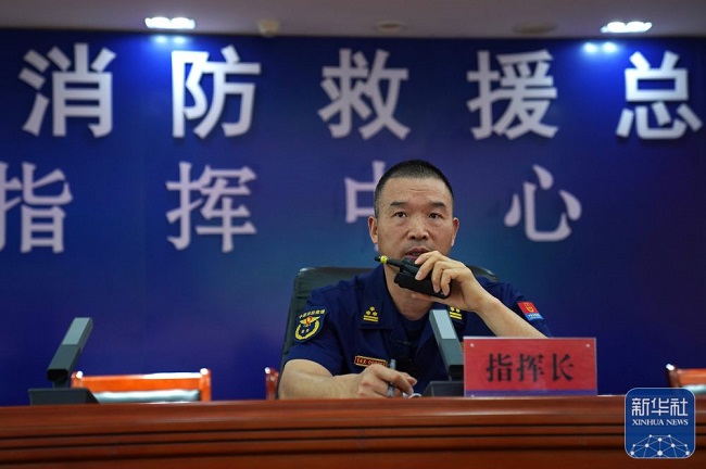 江西省消防救援總隊(duì)指揮中心專業(yè)技術(shù)一級指揮長李勝利在江西消防救援總隊(duì)指揮中心進(jìn)行遠(yuǎn)程調(diào)度(2022年9月14日攝)。新華社記者 萬象 攝
