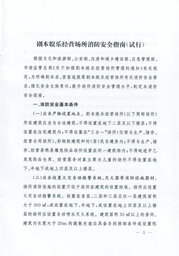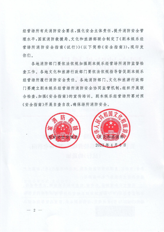 國(guó)家消防救援局 文化和旅游部關(guān)于印發(fā)劇本娛樂(lè)經(jīng)營(yíng)場(chǎng)所消防安全指南(試行)的通知