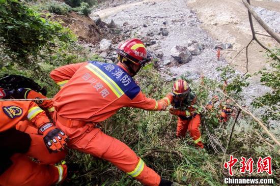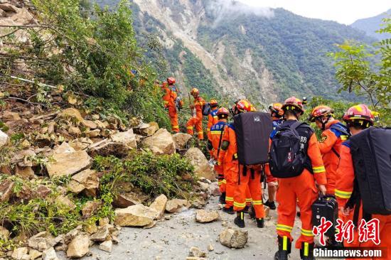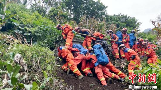 消防救援人員徒步前往石綿縣幸福村開展救援工作。 王新宇 攝
