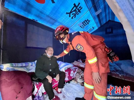 磨西鎮(zhèn)大衫樹村安置點帳篷內(nèi)消防救援人員安撫受災(zāi)的老人。江明渝 攝