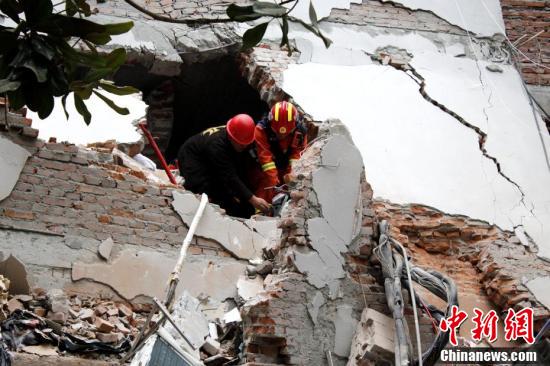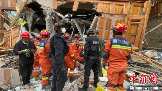 救援人員在倒塌的磨西鎮(zhèn)老街大西印畫酒店開展救援。 四川消防供圖