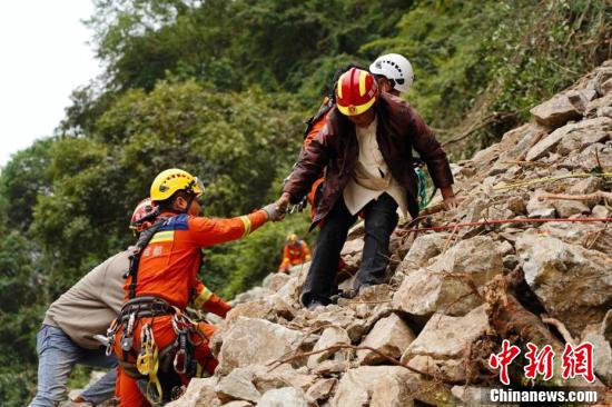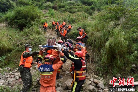 因陸路道路垮塌,車輛通行受阻,消防救援人員用肩搭建橋轉(zhuǎn)移被困人員。四川消防供圖