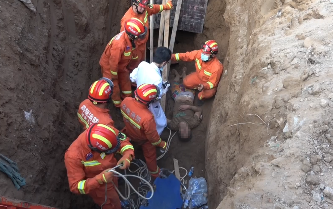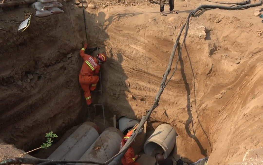 消防員到達(dá)現(xiàn)場(chǎng)后經(jīng)勘查得知,該塌方管道距地面深度約有4米,一名工人被埋壓,坑底有二次塌方的危險(xiǎn)。