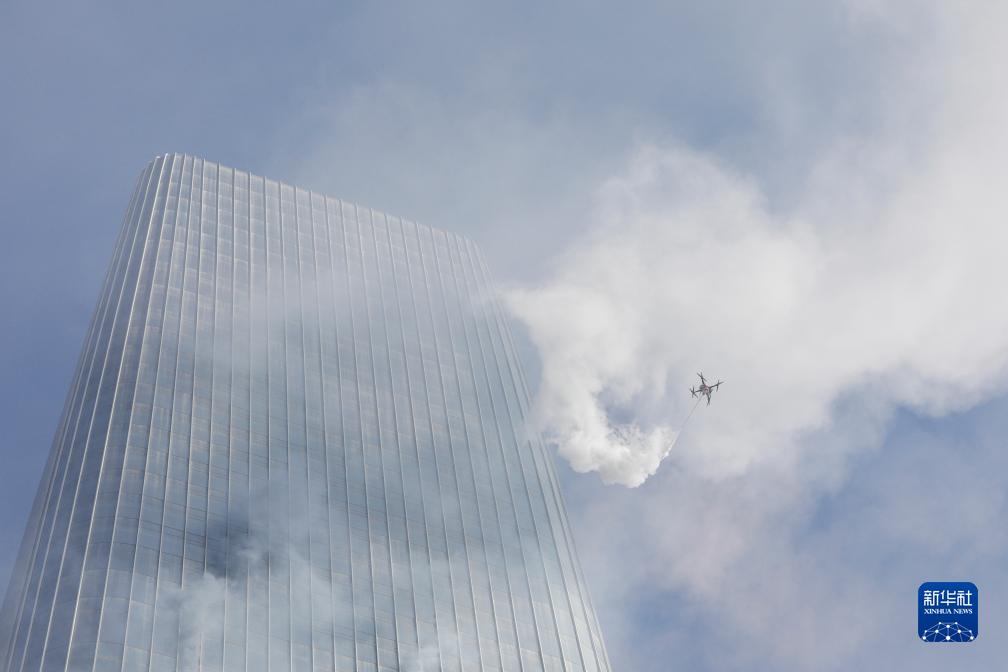 1月8日,高噴滅火無人機進行高層建筑滅火救援實戰(zhàn)演練。