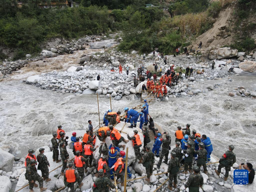 9月6日,武警四川總隊甘孜支隊救援官兵在瀘定縣磨西鎮(zhèn)燕子溝河谷,與多方救援力量一起搭建通往磨子溝村的橋梁。新華社發(fā)(葉小龍 攝)